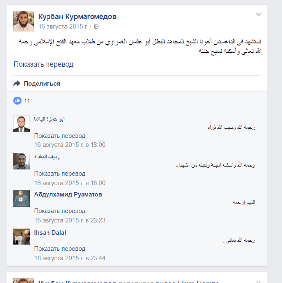 «В Дагестане ушел шахидом наш брат, шейх, муджахид, герой Абу ‘Усман аль-Гъимрави, один из студентов института «Фатх Ислями». Да помилует его Аллаh и поселит его в просторах рая».