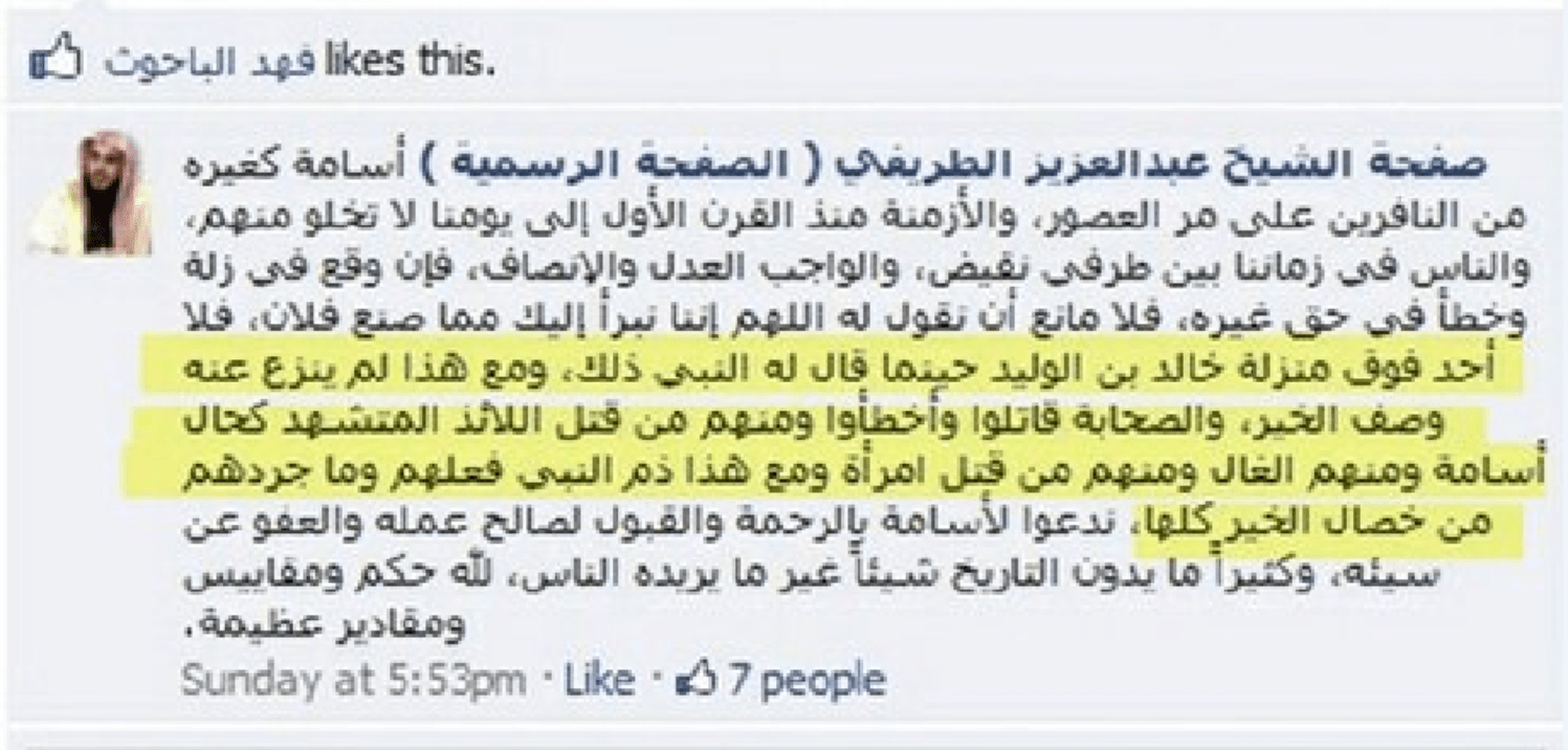«Усама, как и все остальные, которые были на протяжении веков с первых времен. Сегодня люди придерживаются двух противоположных позиций. Но справедливость и беспристрастие обязательно должно быть. Если он споткнулся и совершил ошибку в отношении других, то нет проблем, если мы скажем ему: «О Аллаh, мы не причастны к тому, что совершил такой-то. Ведь нет никого выше Халида бин аль-Уалида, когда пророк ﷺ сказал ему такое, но вместе с этим он не аннулировал его хорошее положение. Сподвижники убивали и ошибались. Из них есть те, кто убил произнесшего шахаду, как это делал Усама… из них и те, кто убил женщину, и пророк ﷺ осудил их за это, но вместе с этим он не списал их с благого положения в целом».