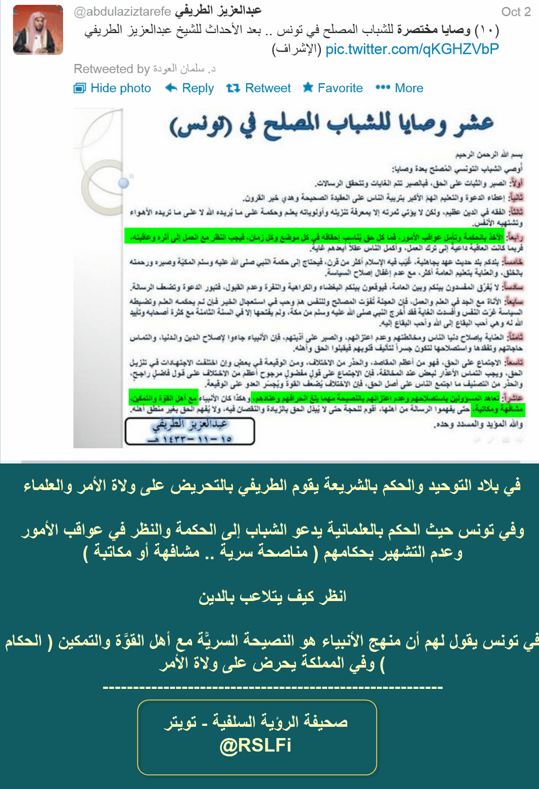 И потом, ат-Тарифи не поддерживает игил и других террористов, как это пытаются навязать мурджиа. Об этом здесь: