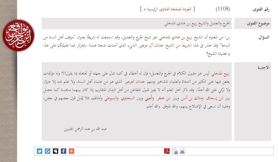 «В той (моей фетве), на которую указал спрашивающий, я хотел сделать насиха нашим братьям ученым и проповедникам, чтобы они, критикуя (ошибки) друг друга, допущенные в статьях или лекциях, отдалялись от джарха и упоминания конкретных личностей (во время критики), так как это может привести к ненависти и вражды между учеными».