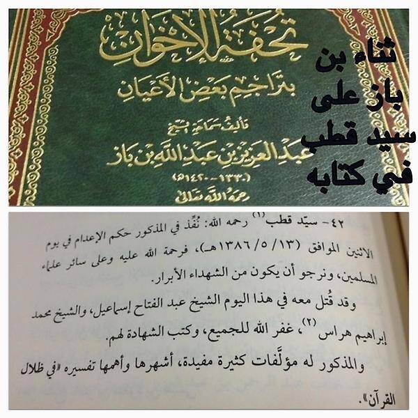 Ибн Баз в своей книге «ТухIфату аль-Ахяр» также хорошо отозвался о Сейид Къутбе, называя его шахидом и ученым, но сделал опровержения его заблуждению.