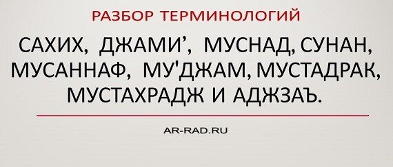 Книги бывают по принципу: Сахих, Муснад, Джами’, Сунан, Мусаннаф, Му’джам, Мустадрак, Мустахрадж и аль-Аджзаъ аль-Хадисийя».