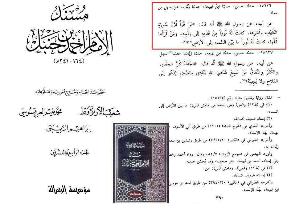 15626 — حَدَّثَنَا حَسَنٌ، حَدَّثَنَا ابْنُ لَهِيعَةَ، حَدَّثَنَا زَبَّانُ، عَنْ سَهْلِ بْنِ مُعَاذٍ، عَنْ أَبِيهِ، عَنْ رَسُولِ اللهِ صَلَّى اللهُ عَلَيْهِ وَسَلَّمَ أَنَّهُ قَالَ: » مَنْ قَرَأَ أَوَّلَ سُورَةِ الْكَهْفِ وَآخِرَهَا، كَانَتْ لَهُ نُورًا مِنْ قَدَمِهِ إِلَى رَأْسِهِ، وَمَنْ قَرَأَهَا كُلَّهَا كَانَتْ لَهُ نُورًا مَا بَيْنَ السَّمَاءِ إِلَى الْأَرْضِ