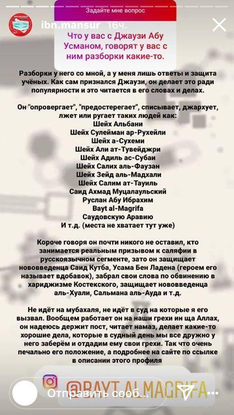 • Шестое: Шангараев оскорбил аль-Фаузана, аль-Альбани и других, упомянув на ряду с ними свою группу ВК Bayt al-Magrifa. По мнению этого человека, кто посягнул на его группу в ВК Bayt al-Magrifa, он ненормальный.