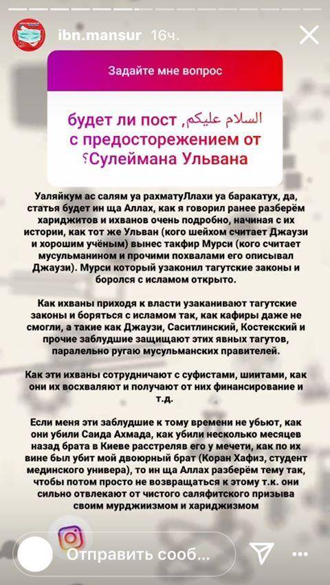 И потом по поводу амана, шейх аль-Мутейри ничего мне не отправлял, он лишь рассказал. И о каком «амана» ты говоришь? У тебя нет морального и юридического права произносить слово «амана».