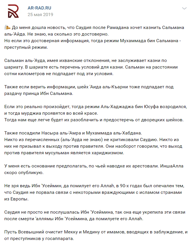 Во-первых: он просто на ровном месте мозги пудрит людям, принимая их за идиотов! На скрине видно, что я написал: «Если это достоверно». Также написал: «Если достоверно, то режим Ибн Сальмана преступный».