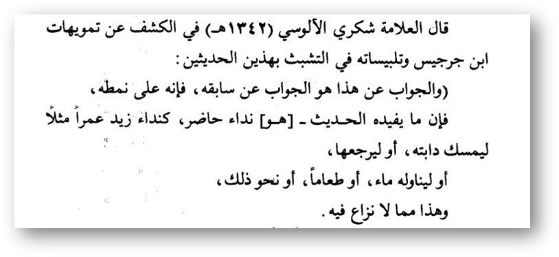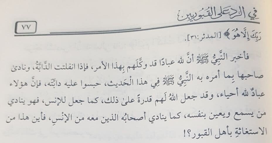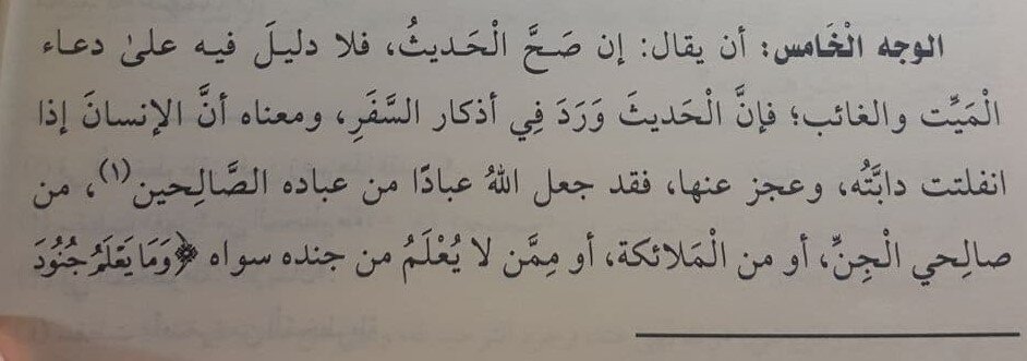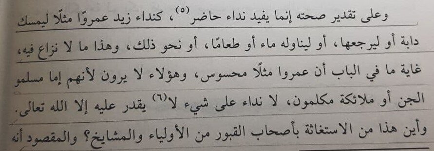 Во-вторых: такфириты, которые ссылаются на шейха ас-Синди, как всегда сделали тадлис, ибо шейх ас-Синди, говоря о ширке, исключил данный вид ангелов и обращение к ним, сказав: «И эти хадисы на данную тему, если они достоверны (а они достоверны — от ред.), являются исключением, ведь в них (упоминается) зов к живому присутствующему, которые может (выполнить)…
