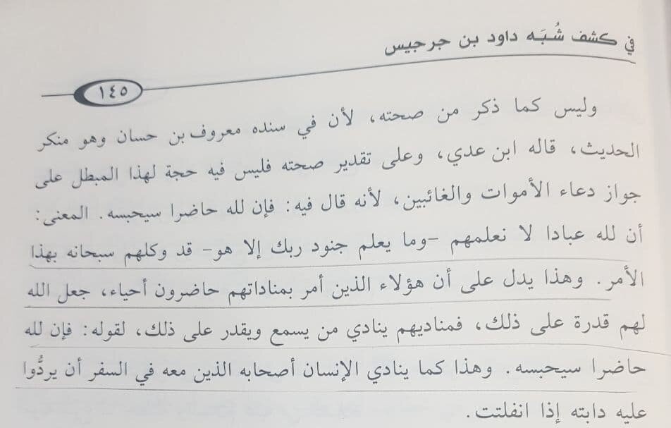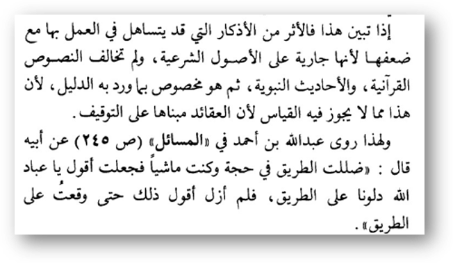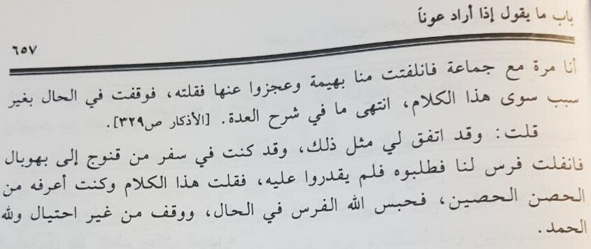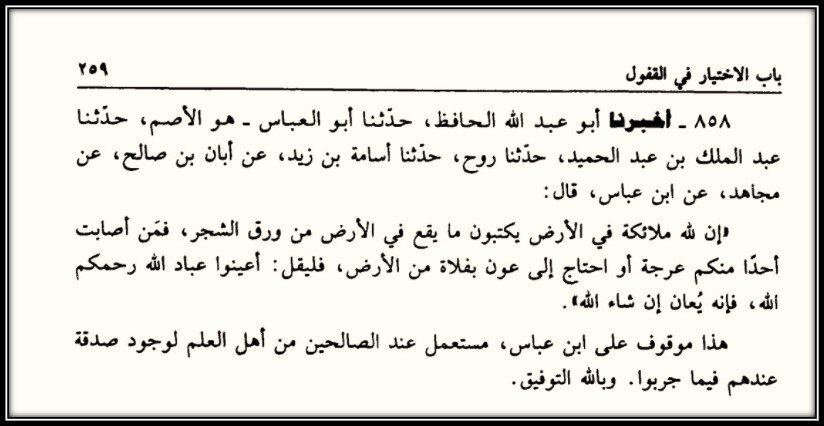 Однажды Ибн аль-Мубарак заблудился в сафаре, и до него дошел хабар, что если при таком случае сказать: «О Рабы Аллаhа, помогите», ему помогут», и он захотел найти иснад этого сообщения, но так и не нашел, и не стал взывать с этими словами.