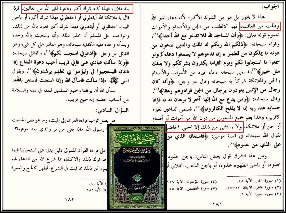 Если они скажут: «Мы их не видим, поэтому взывать нельзя». Мы скажем: если мы их не видим, это не значит что они не присутствуют, и кто поставил такое условие? Вы ведь сами говорите: ширк — просьба того, на что способен лишь Аллаh, либо просьба у отсутствующего, не такли? Но ведь присутствующий может быть невидимым, об этом подробно будет в нижних главах.