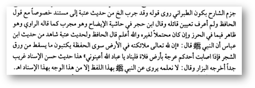 إِنَّ للهِ مَلائِكَةً فِي الأَرْضِ سِوَى الْحَفَظَةِ يَكْتُبُونَ مَا سَقَطَ مِنْ وَرَقِ الشَّجَرِ، فَإِذَا أَصَابَ أَحَدَكُمْ عَرْجَةٌ بِأَرْضٍ فَلاةٍ فَلْيُنَادِ: أَعِينُوا عِبَادَ اللهِ
