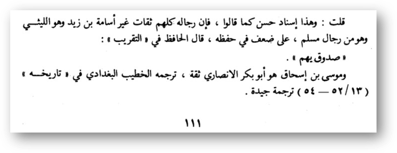«Передатчики данного хадиса заслуживают доверия, учитывая слабость некоторых, разве что Зейд ибн ‘Али не застал ‘Утбу.