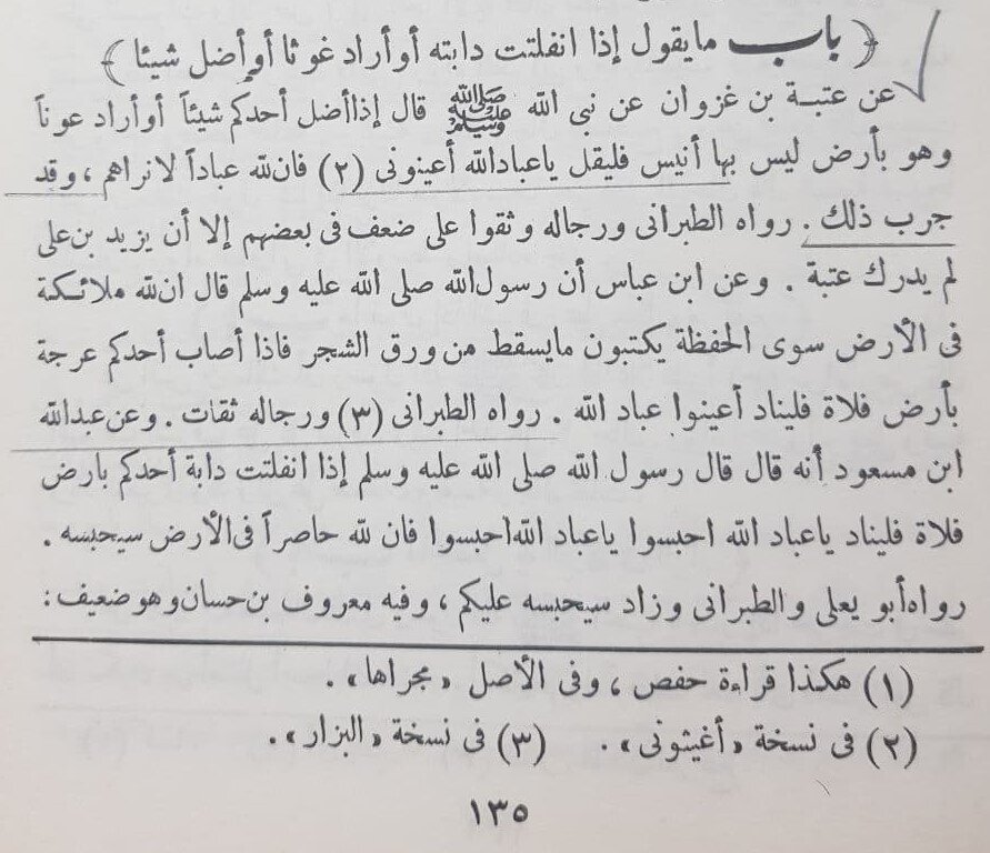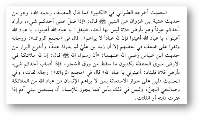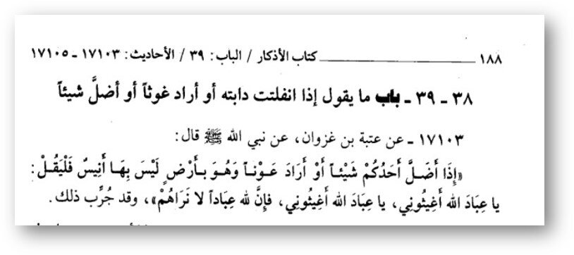 إِذَا أَضَلَّ أَحَدُكُمْ شَيْئًا، أَوْ أَرَادَ أَحَدُكُمْ عَوْنًا وَهُوَ بِأَرْضٍ لَيْسَ بِهَا أَنِيسٌ، فَلْيَقُلْ: يَا عِبَادَ اللهِ أَغِيثُونِي، يَا عِبَادَ اللهِ أَغِيثُونِي، فَإِنَّ للهِ عِبَادًا لَا نَرَاهُمْ
