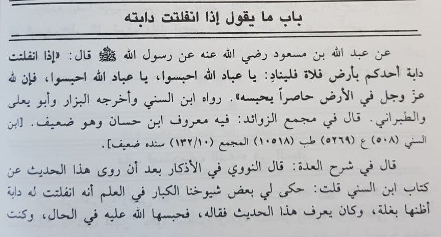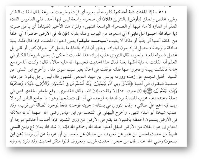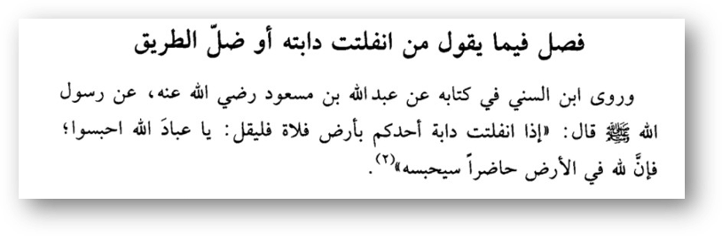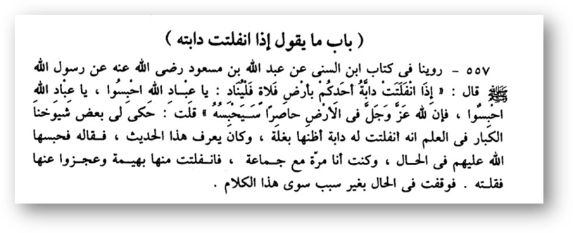 «Если ваше животное освободилось (вырвалось) от пут в пустынной местности, то пусть воззовет: «О рабы Аллаhа, удержите! О рабы Аллаhа, удержите! Поистине, у Аллаhа есть присутствующий на земле, он удержит»