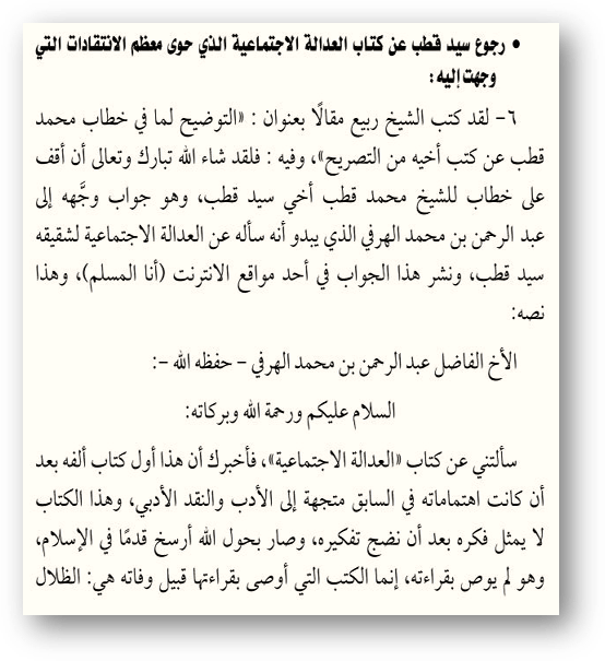 ≡ ‘Абд ар-Рахман аль-Харафи написал письмо Мухаммад Къутбу, спрашивая его о первых книгах Сейид Къутба, как «Социальная справедливость», на что Мухаммад Къутб ответил: «Ты меня спросил о книге «Социальная справедливость»(в которой он плохо отзывается о сподвижниках), и я отвечаю тебе, что он (Сейид Кутб) написал тогда, когда он преследовал литературную критику. Но после того, как он прозрел, эта книга больше не представляет его взгляды. Он, с помощью Аллаh, стал крепче в исламе, и он не советует читать его книги. Он лишь советует читать его книгу «В сени Корана»…»Вот подтверждение из книги Ибн Аби аль-‘Айнейна «Аль-Къауль аль-Бади» стр. 48, где он подтверждает это, и еще приводит в добавок подтверждение аль-Халиди.Скрин: