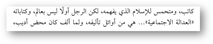≡ Пишет Ибн Аби аль-‘Айнейн: «(Социалистическая партия аль-Уафд) оказала на него влияние в формировании его социалистических взглядов. Его книга «Социальная справедливость» была одна из первых книг (написанных им в тот период)…»