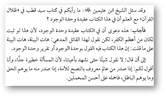 ≡ Шейх Ибн ‘Усеймина, да помилует его Аллаh, когда его спросили о том, что якобы Сейид Кутб говорит о единстве бытия, он сказал: «Это лишь утверждение, что в книге есть акъида единства бытия. Ведь если-бы это было достоверно, то это один из опаснейших видов куфра. Мы скажем тем (кто приписывает это Сейиду): «Приведите ваши доказательства, что в этой книге есть слова о единстве бытия, или подтверждение единства бытия…