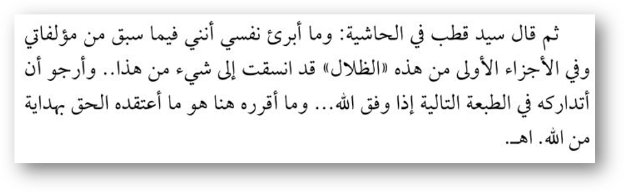 Знаете о каком издании говорит уважаемый шейх Бакр? О говорит о том, что чем сказал сам Сейид в сносках своего «аз-Зиляль»: «…я отрекаюсь от того, что была ранее написано мной в первых томах этой книги «аз-Зиляль»… я надеюсь, что я внесу поправки в следующем издании, если Аллаh дарует удачу.. и то, что я утвердил здесь, это то, во что я убежден — истина от Аллаhа».