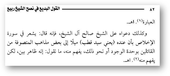 Шейх аль-Альбани о тафсире Къутба к суре «аль-Ихляс» сказал: «Он передал слова суфиев в отношении этого и нельзя его понять иначе, как он говорит про уахдат-уль-вуджуд» Сл. Кассета «аль-Мафахим». Так что и шейх аль-Альбани тоже говорил о том, что Сайд Къутб говорил про уахдат-уль-вуаджуд и эта запись есть в «Сильсилят-уль-худа уа-н-нур».