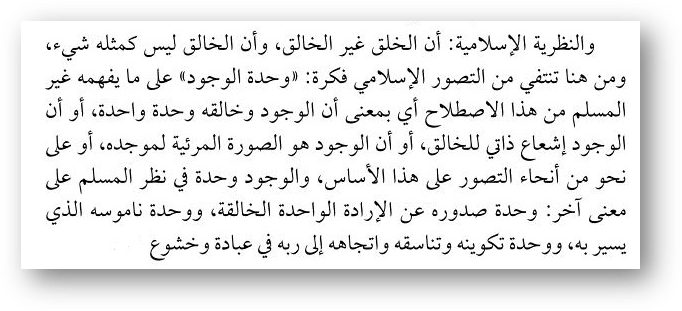 • Во-третьих: а что говорит сам Сейид Кутб? Говорит Сейд в своей последней книге «Зиляль» том 1, стр. 106, в тафсире «Коровы»: «Исламская теория гласит, что творение, не есть творец, что нет ничего подобно Творцу, и здесь в исламском восприятии терпит несостоятельность идея о единстве бытия, в которую верит немусульманин…»