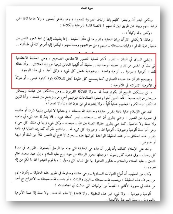 В этой же книге «аз-Зиляль» в суре «Женщины говорит: «…истина в том, что за божественностью Творца следует рабство творений, а также, что существует божество и рабство (творение). Божественность лишь одна, а рабство в этом бытие охватывает все и всех…»