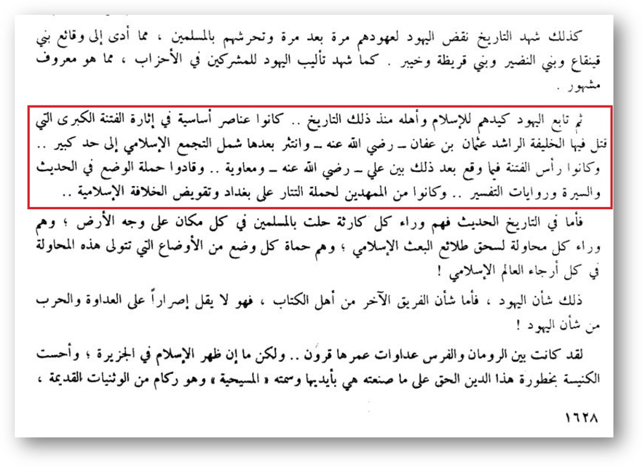 Доктор Раби’ аль-Мадхали знал об этом, знал, что Сейид, да помилует его Аллаh, давно отрекся от этих книг, где он некрасиво отозвался о сподвижниках, как ‘Усман бин ‘Аффан, Му’авия и ‘Амр ибн аль-‘Ас. Я приведу вам последние взгляды Сейида о ‘Усмане ибн ‘Аффане, дабы вы знали о любви Сейида к нему, да будет доволен им Аллаh.≡ Пишет Сейид о сподвижниках в своей последней книге «аз-Зиляль» на стр. 1628: «И с тех пор иудеи направили свои козни на ислам и его приверженцев. Они были главными фигурами больших смут, в которых убили праведного халифа ‘Усмана бин ‘Аффана, да будет доволен им Аллаh, и после этого фитна охватила все исламское общество в большей степени. Они также были главарями фитны, которая также случилась между ‘Али, да будет доволен им Аллаh, и Му’авией…»