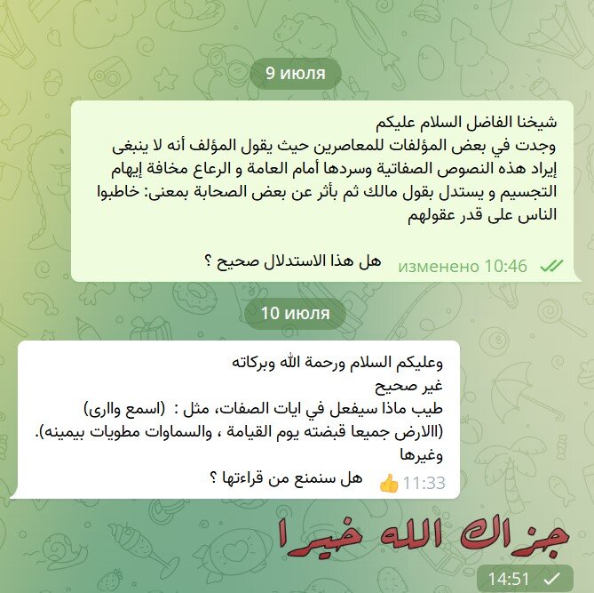 «Уважаемый шейх. Я обнаружил в некоторых современных книгах автор говорит, что не стоит приводить тексты атрибутов и цитировать их простолюдину, дабы (ошибочно)не внушить таджсим.