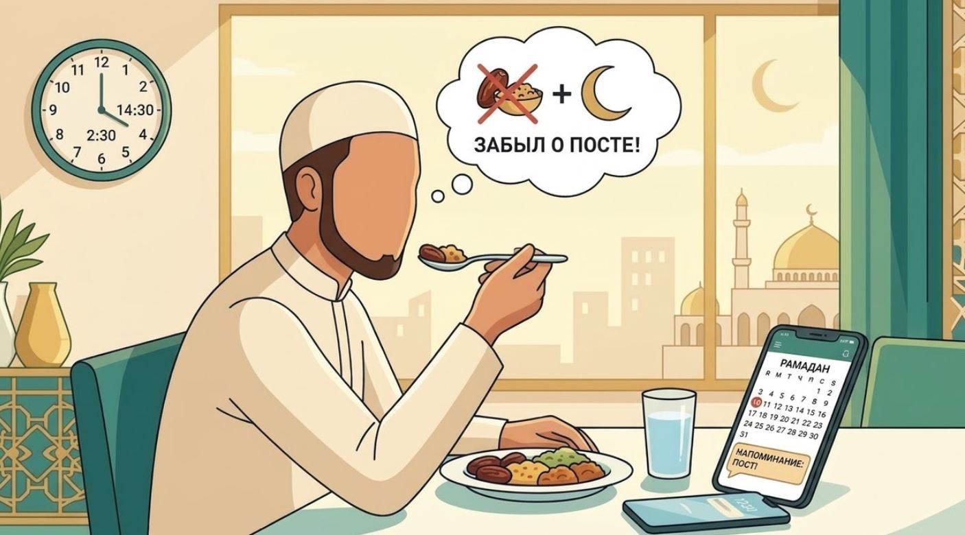 «Кто, забыв о посте, поел или попил, пусть продолжает поститься, ибо это Аллах накормил и напоил его».
