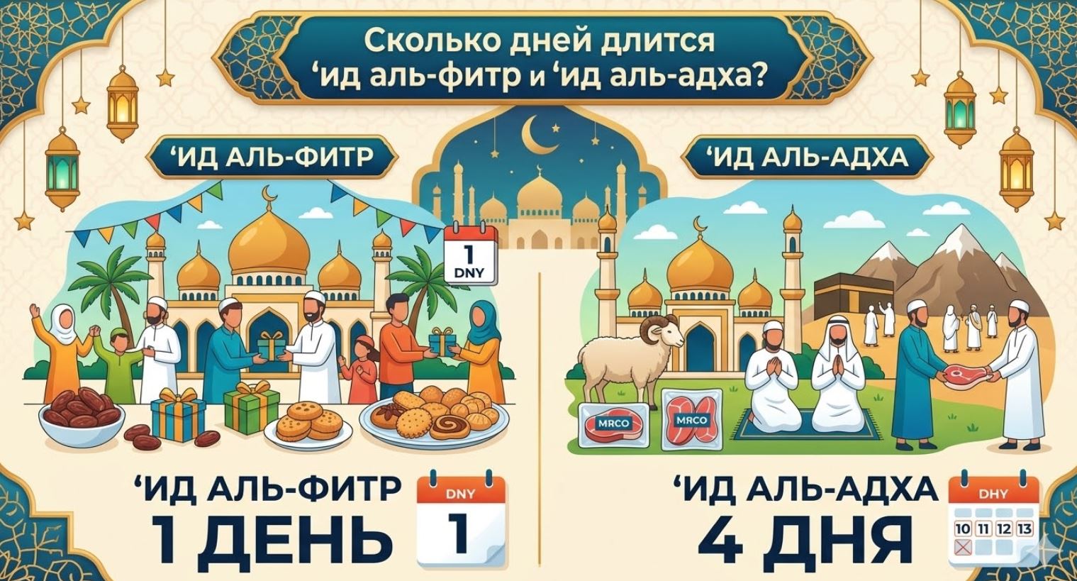 Важное уточнение: Даже в Ид аль-Адха сам праздник — это один день, а последующие три дня — это «дни ат-Ташрик». Они являются праздничными по своей сути (в них едят и пьют), но технически это разные категории дней.